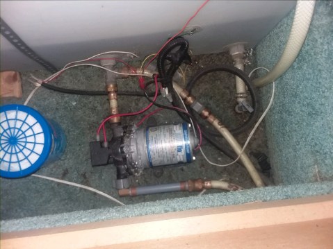 We eventually found out that our water pump was leaking and had been for some time. The pump is located underneath our bed — an area that we do not typically visit often. Crap.
