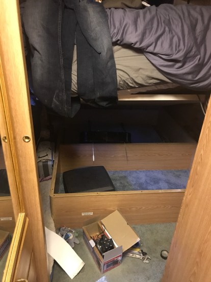 Andy quickly went on a hunt for a new pump, and we replaced it as soon as we could. But that left us with the mess of pulling everything in storage from beneath the bed — blankets, winter clothes, etc. — and cleaning everything that was wet. We then had to find a place to store all of these things while we dried out the area under the bed.